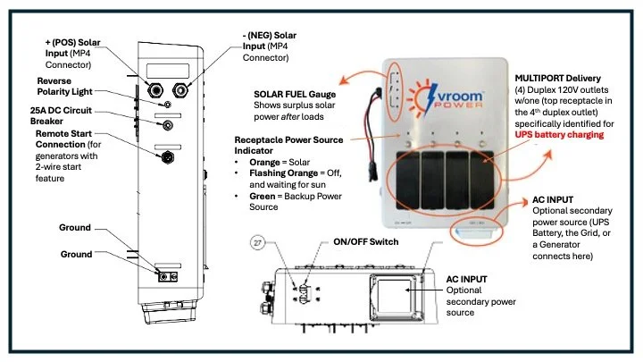 This VS3000, manufactured in the USA by Vroom Solar, Inc. (the “Warrantor”), is warranted to be free from substantial defects in workmanship and materials under normal use and service, for a period of 12 months from the date of purchase by the buyer (the “Purchaser”). It covers the cost of parts and labor necessary to correct substantial defects in material or workmanship, deemed warrantable by the Warrantor. 1-Year, 5-Year and 10-Year Warranty extension options are available.