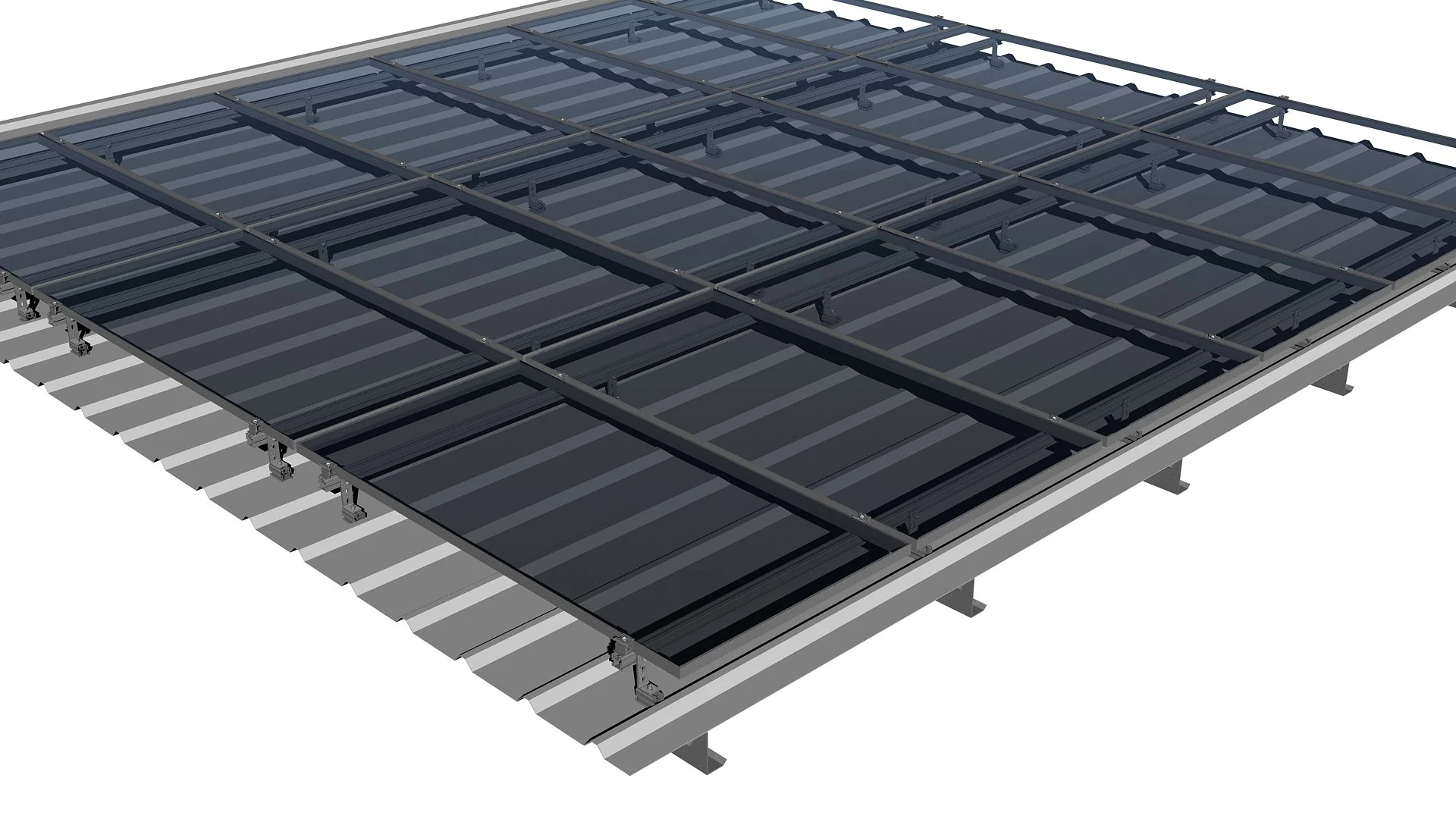 Our roof racking system requires approximately 7’ x 14’ of roof space and is suited for installation on remote farm buildings and shelters, sheds, carports, etc.